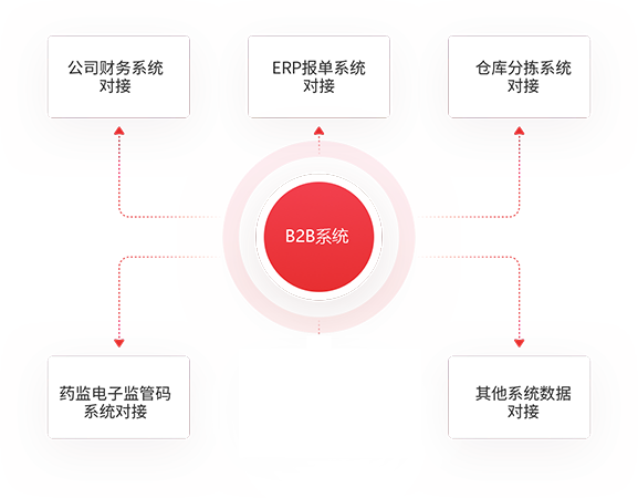 B2B报货管理系统除了自身功能强大外,还要与公司的财务系统、ERP报单系统、仓库分拣系统、药监电子监管码系统直接打通,将需要分离给其他系统数据直接通过接对接端口一次性完成,大大减少人工成本和处理速度。